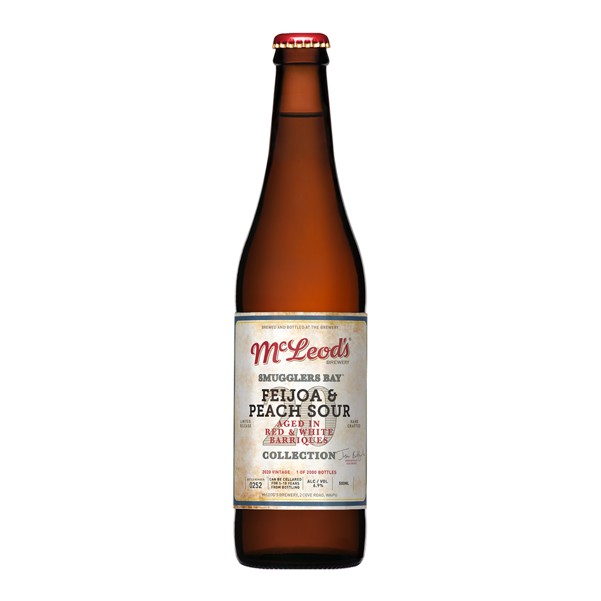 This unique beer is a blend of several vintages from our barrel cellar. After aging in former NZ red & white wine barriques, it aged on fresh Cromwell peaches & Northland feijoas for several months. Cold conditioning followed for several months after. An array of spice, wine-soaked oak & layers of feijoa to soft, sweet peach up front gives way to bright acidity & a lingering complex finish. Drink now or cellar as long as you can resist.